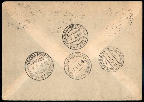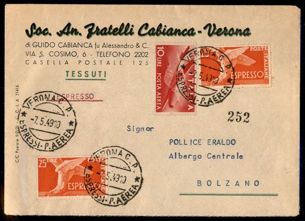 Due 25 lire Espressi (28) + 10 lire Aerea (130) su lettera espresso da Verona per Bolzano del 7.5.49