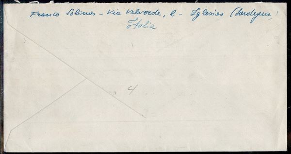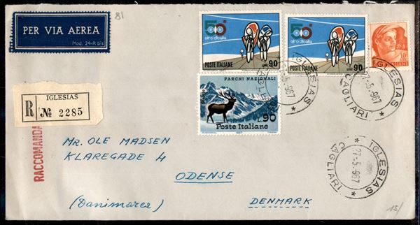 Due 90 lire Ciclismo + 90 lire Parchi Nazionali + 10 lire Michelangiolesca (901 + 1042 + 1046) su raccomandata aerea da Iglesias per Odense del 27.5.957