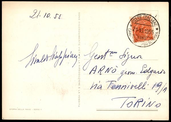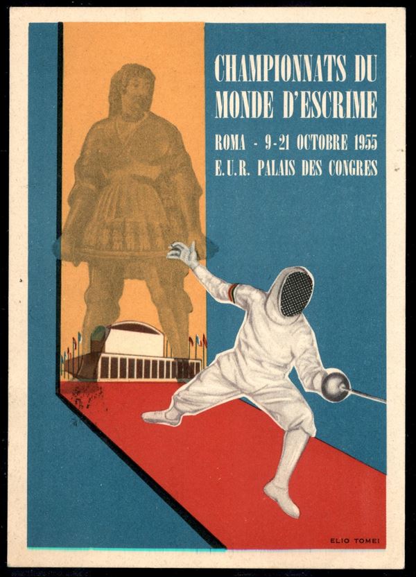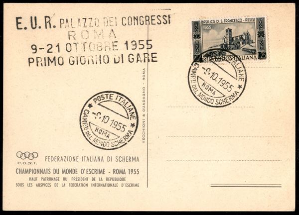Due cartoline con annulli dei Campionati del Mondo di Scherma 9 e 21 ottobre 1955 - primo e ultimo giorno di gare affrancate con Basilica di San Francesco (su cartolina ufficiale) e Siracusana