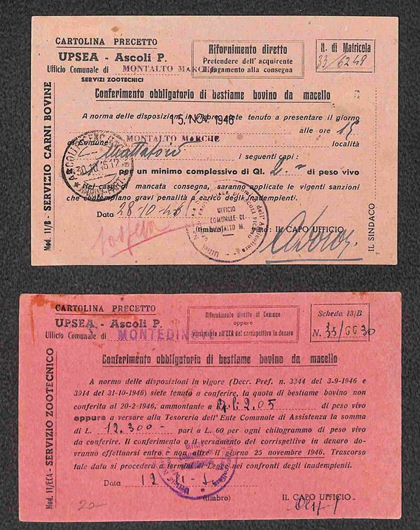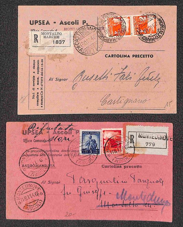 Due cartoline raccomandate viaggiate nell'ott./nov. 1946 da Montedinove per Montelungo e da Montalto Marche per Castignano affrancate 8 lire con valori Democratica