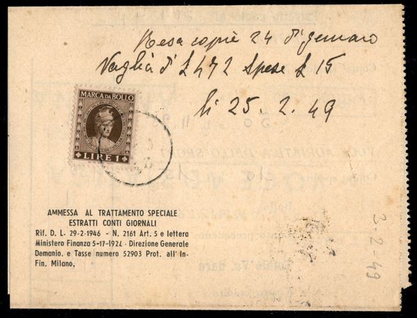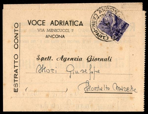 Estratto conto giornali con 6 lire Democratica (554) da Ancona a Montalto Marche del 3.2.49