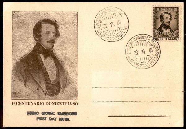 FDC Donizetti su cartolina Maximum con annullo del Raduno Filatelico di Bergamo del 23.10.48 (593) - non viaggiata