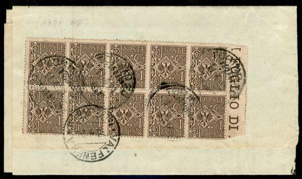 Floreale blocco di dieci 1 cent (68) al verso di lettera da Valfenera 6.4.21 per cittą