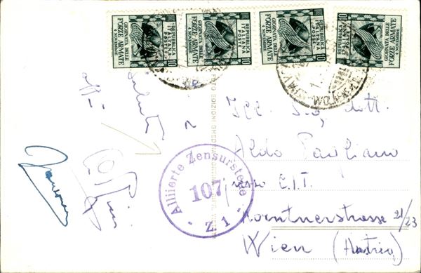 Forze Armate striscia di tre + singolo 10 lire su cartolina per Vienna con bolli di censura