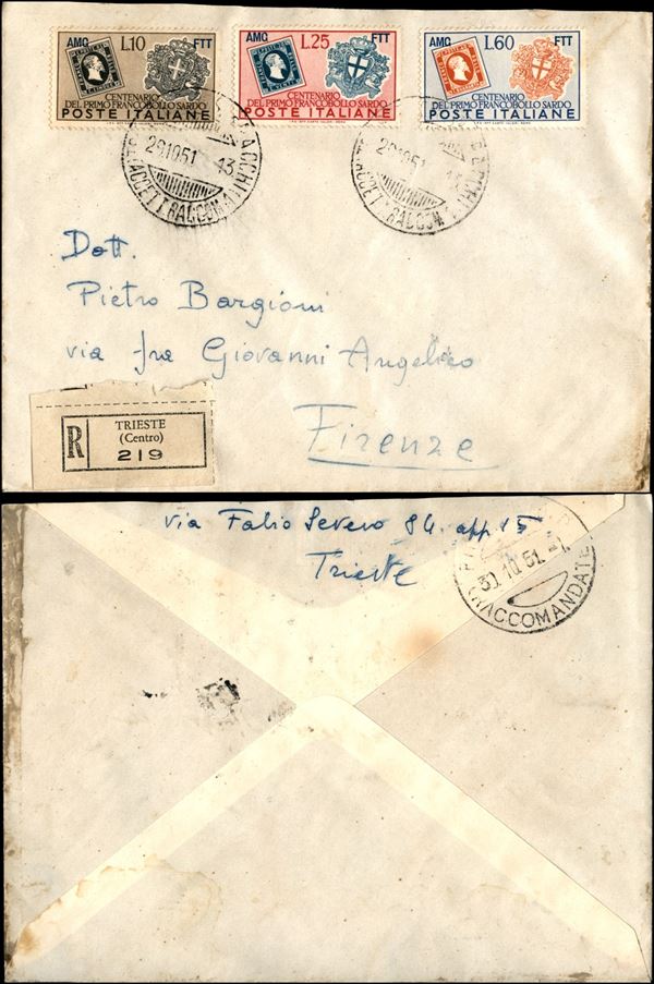 Francobollo Sardo (672/674) - serie completa su raccomandata da Trieste a Firenze del 29.10.51