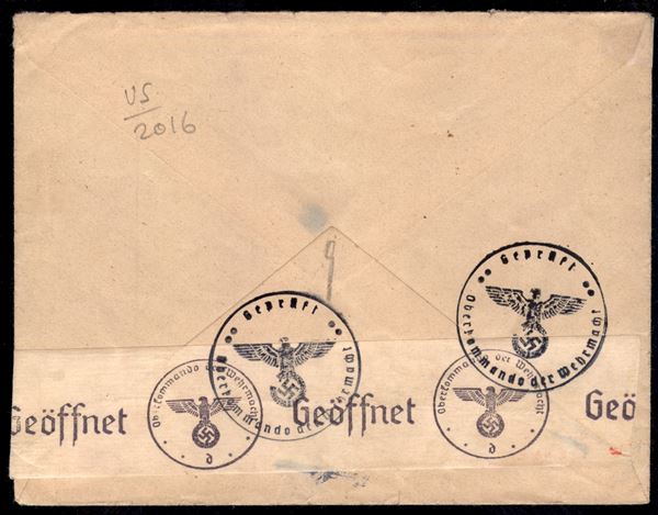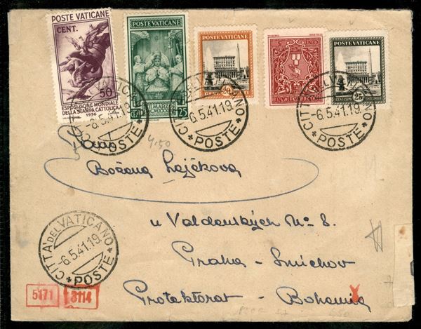 Giardini e Medaglioni 5 cent + 20 cent + 25 cent + Stampa Cattolica 50 cent + Pio XII 25 cent (19 + 22/3 + 50 + 68) su lettera del 6 maggio 1941 per la Boemia - al verso bolli e fascetta di censura