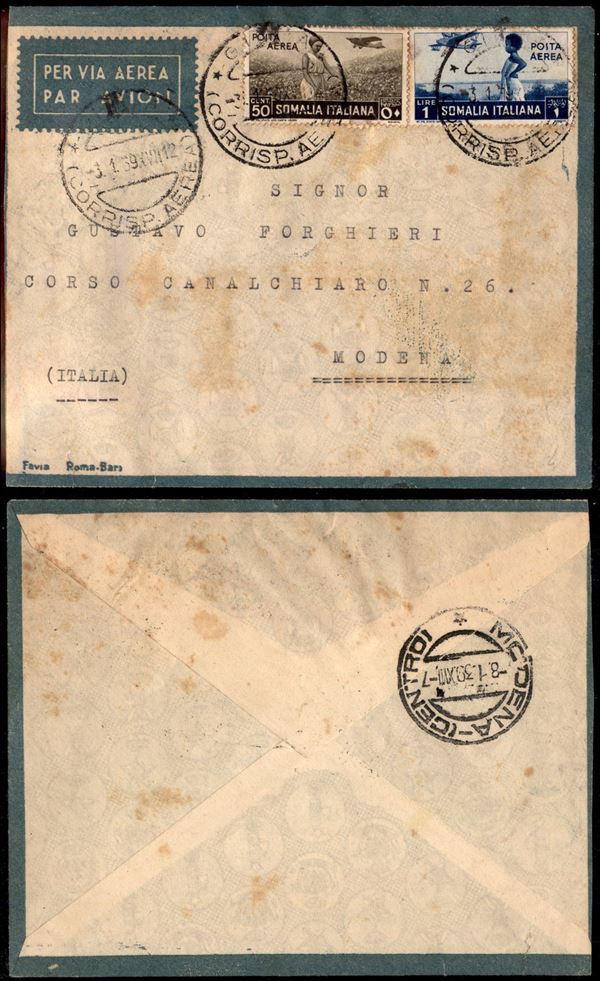 Gimma (Corrisp. Aerea) - aerogramma per Modena del 3.1.39 con affrancatura di Somalia (Aerea 18 + 23)