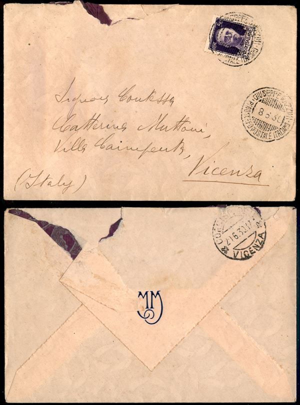 Giuseppe Mazzini/Piroscafo Postale Italiano - 50 cent (251) su busta per Vicenza del 8.6.30