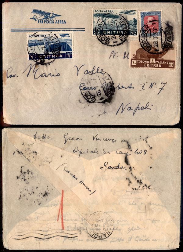 Gondar/Posta Aerea - aerogramma per Napoli del 26.7.37 con affrancatura d'Eritrea (196 + 205 + Aerea 17 + 21)