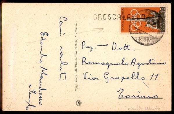 Guller pieno 23.6.59 + lineare Groscavallo entrambi annullatori su cartolina per Torino con 15 lire Preolimpica - splendida