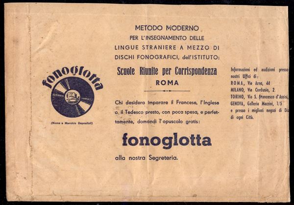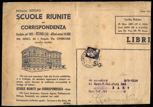 Imperiale 7 1/2 cent (244) isolato su busta in tariffa ridotta editori da Agenzia Scuole Riunite Roma 25.5.39 per Bari