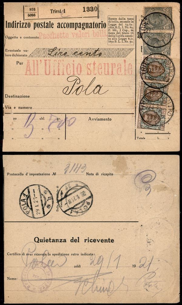 Indirizzo Postale Accompagnatorio da Trieste a Pola del 27.1.21 con affrancatura di Regno (77 tre + 108 due)