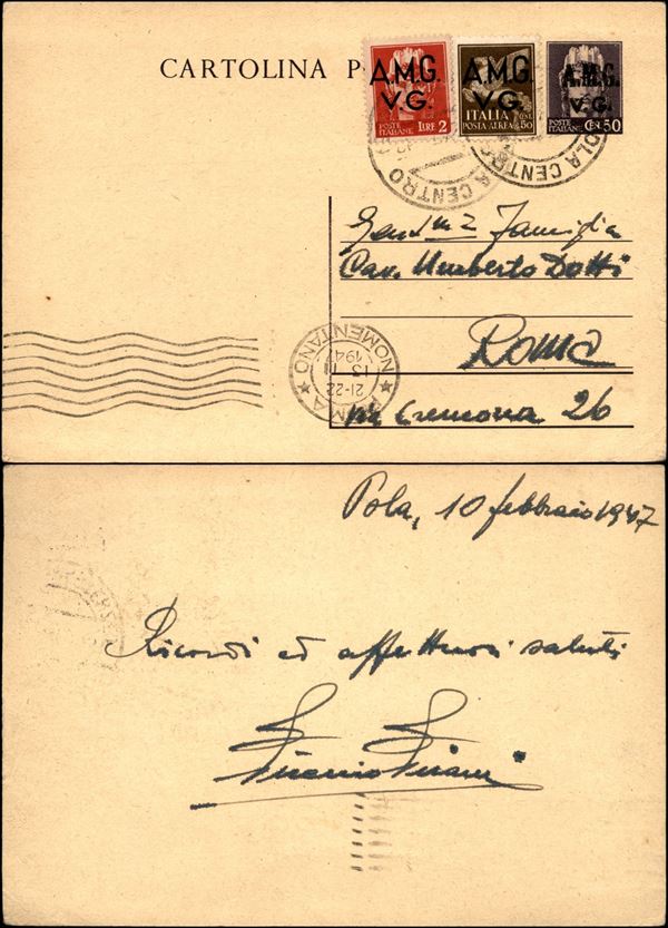 Intero postale da 50 cent (1) con complementare (9 + Aerea 1) da Pola a Roma del 10.2.47