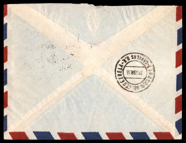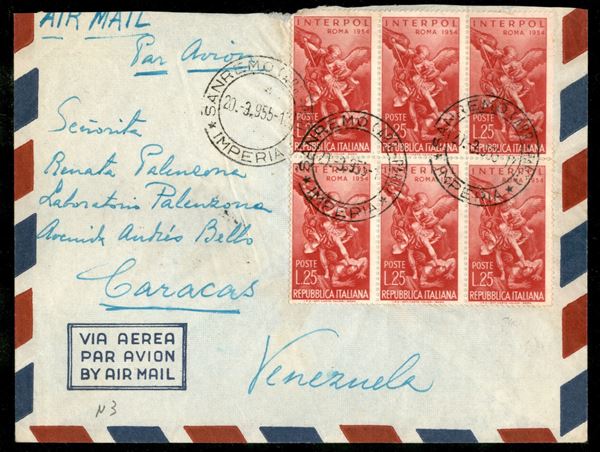Interpol blocco di sei 25 lire (744) su lettera via aerea per Caracas (Venezuela) da Sanremo 20.3.55 - busta leggermente rifilata in alto