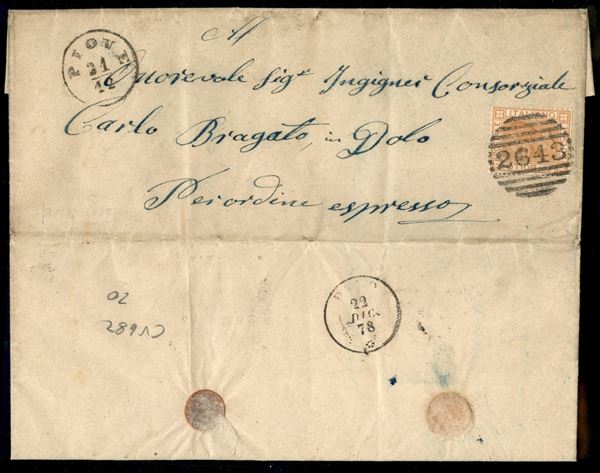 Lettera con 20 cent (28) con annullo numerale a sbarre 2643 da Piove 21/12 del 1878 a Dolo - annullo di fornitura austriaca