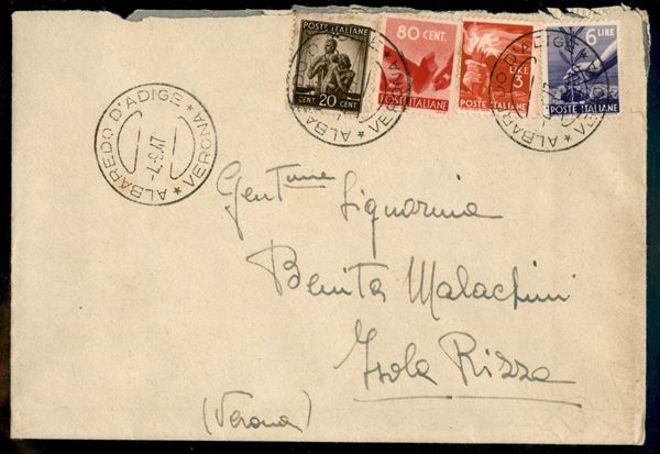 Lettera con bella affrancatura quattro colori Democratica 20 cent + 80 cent + 3 lire + 6 lire da Albaredo D'Adige 4.9.47 per Isola Rizza
