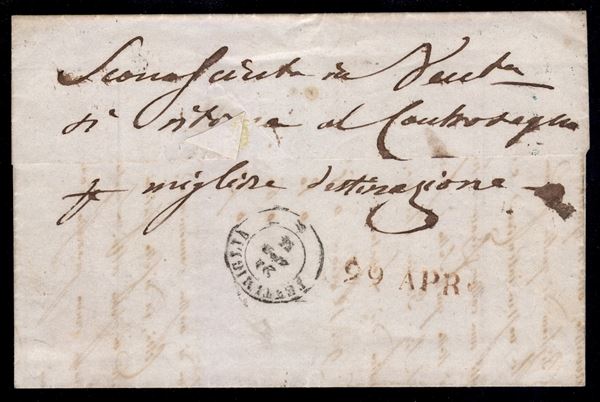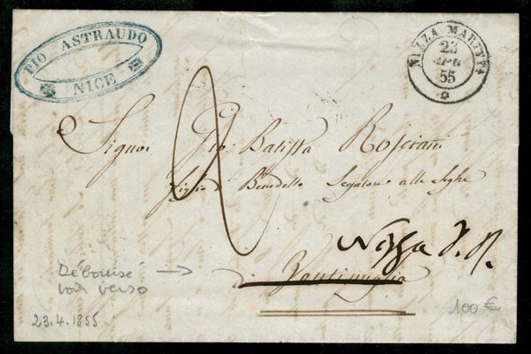 Lettera con d.c. Nizza Maritt.a 23 apr. 55 per Ventimiglia con segno di tassa 2 decimi - al verso deboursè manoscritto Sconosciuta a Vent.a si ritorna al Controsegno per migliore destinazione
