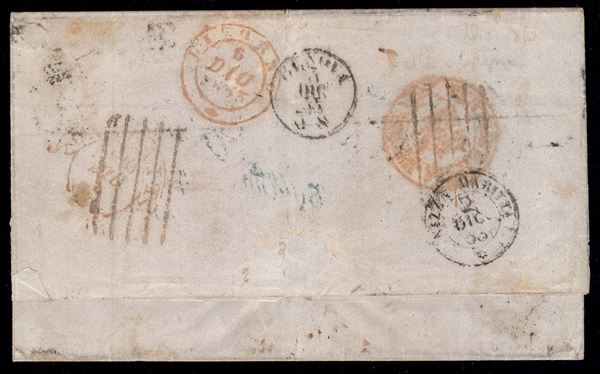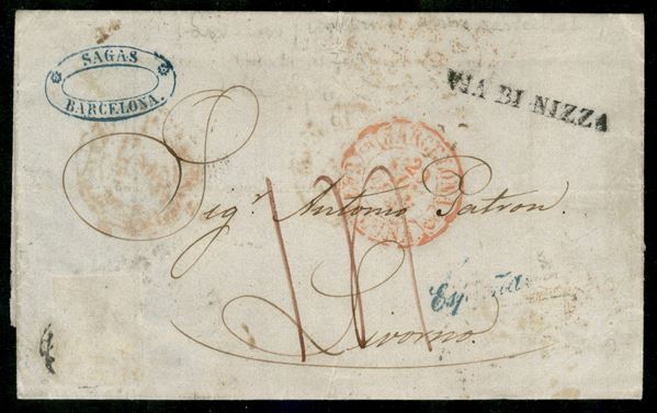 Lettera da Barcellona del 28 nov. 1853 non affrancata per Livorno con bollo lineare Via di Nizza e segno di tassa 14 decimi - a lato il corsivo verde Espana