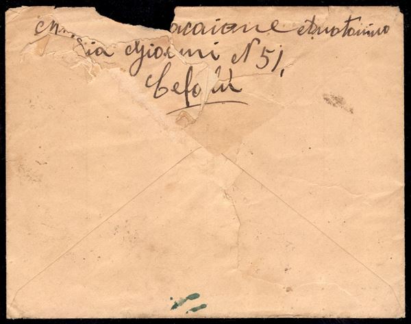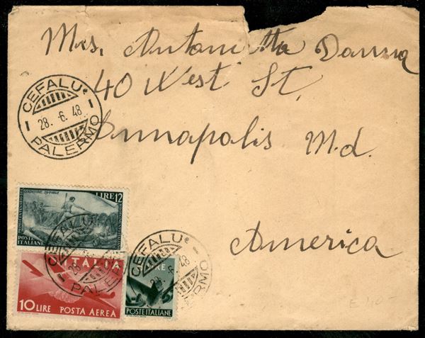 Lettera da Cefalù 28.6.48 per gli USA con Democratica 8 lire + Risorgimento 12 lire + Aerea 10 lire (557 + 586 + Aerea 130) - busta lacerata in alto