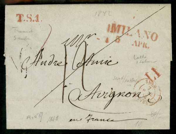 Lettera da Milano 5 Apr. con a lato i bolli L.1 e T.S.1 + d.c. Sard. Antibes 7 Apr. 42 - tutti i bolli in colore rosso - tassa 12 manoscritta