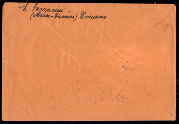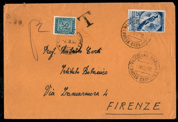 Lettera due porti da Licciana Nardi 1.9.52 per Firenze con Mostra d'Oltremare 25 lire tassata in arrivo con 50 lire Segnatasse (691 + Segnatasse 108) - non comune