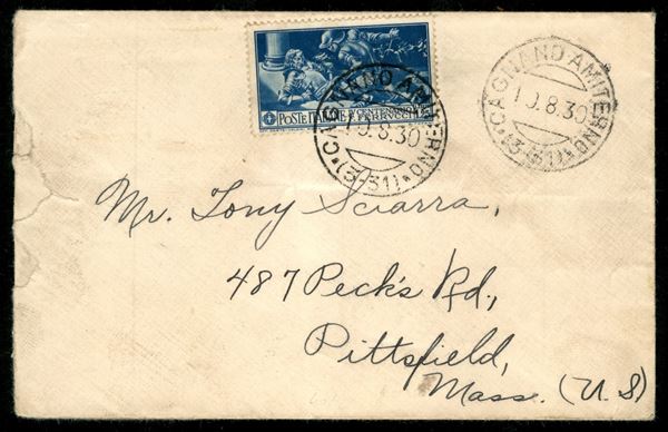 Lettera per gli Stati Uniti con 1,25 lire Ferrucci (279) da Cangnano Amiterno 19.8.30 per Pittfield Mass