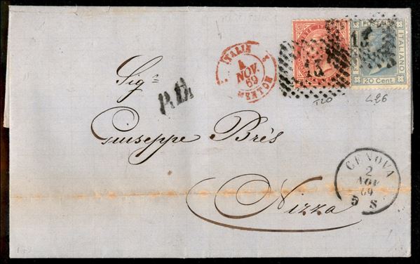 Lettera per la Francia affrancata 40 cent + 20 cent tir. di Londra (20 + L26) - da Genova 2 nov. 69 per Nizza Marittima con bollo di transito Menton in rosso