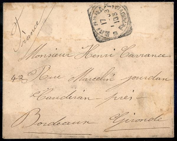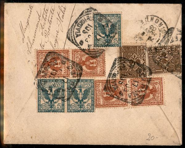 Lettera per la Francia affrancata al verso per 25 cent con due 1 cent + due coppie 2 cent + coppia e singolo 5 cent (68/70) da Bologna 17.1.03