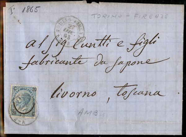 Lettera per Livorno con annullo dell'ambulante Torino Firenze (2A) 27 dic. 65 su 20 cent su 15 (23)