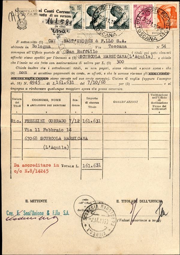 Modulo del servizio riscossioni affrancato con striscia di tre del 85 lire + 10 lire Michelangiolesca + 40 lire Siracusana annullati Bologna Via Toscana 30.11.1968