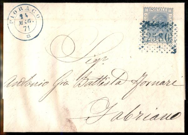 Numerale a punti 2580 con a lato Piorago 24 mag. 71 - entrambi in colore azzurro su lettera affrancata con 20 cent (26) per Roma - lieve piega d'archivio su francobollo ma insieme molto pulito e fresco