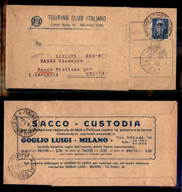 Perfin (CTI) - 35 cent (250) su busta speciale a sacco da Milano a Veggio del 29.1.33