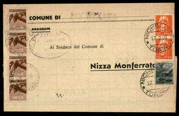 Plico con Imperiale senza fasci coppia 60 cent + Democratica striscia di quattro 10 cent + 40 cent da Nichelino 27.2.46 per Nizza