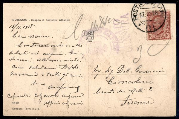 Posta Militare 111 - cartolina da Durazzo (Gruppo di contadini Albanesi) per Firenze del 17.11.1918