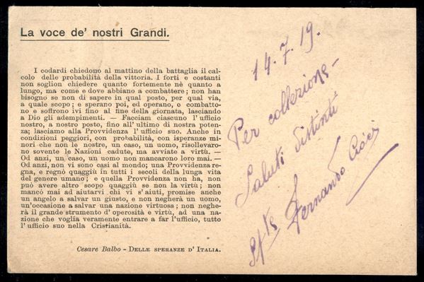 Posta Militare 122 - cartolina per Firenze del 15.7.1919