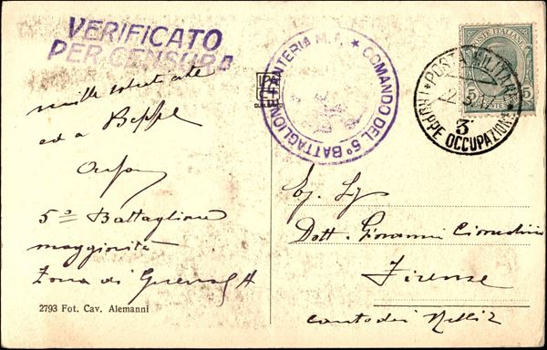 Posta Militare/Truppe Occupazione 3 - cartolina dal Comando del 5° Battaglione Fanteria M.F. (viola) per Firenze del 22.3.1917