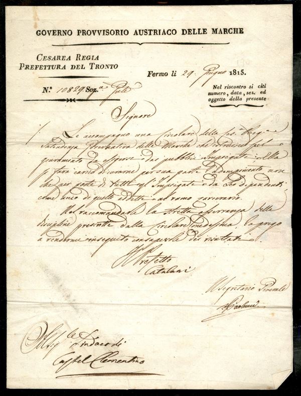 Prefetto del Tronto - circolare del Governo Provvisorio Austriaco delle Marche - da Fermo a Castelclementino del 29 giugno 1815