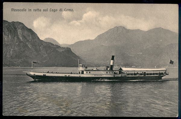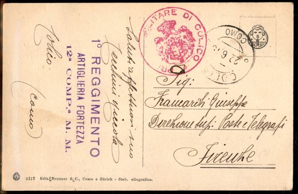 Presidio Militare di Colico - 1 Reggimento/Artiglieria Fortezza/12 Comp.a M.M. - cartolina (Piroscafo in rotta sul Lago) per Firenze del 22.6.1915