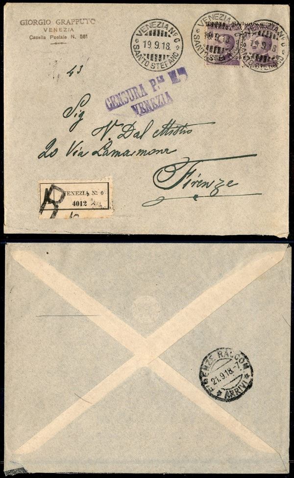 Prestito Nazionale 1917 - coppia del 50 cent Michetti (Unificato 1 varietà) con soprastampe oblique (a cavallo) - raccomandata da Venezia a Firenze del 19.9.18 (1.200+)