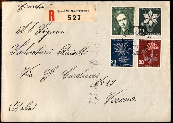 Pro Juventute (475/478) - serie completa su raccomandata da Basilea a Verona del 2.12.46