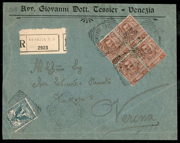 Quartina 10 cent + 5 cent (70/71) su lettera raccomandata da Venezia per Verona del 13.1.06 - 5 cent difettoso