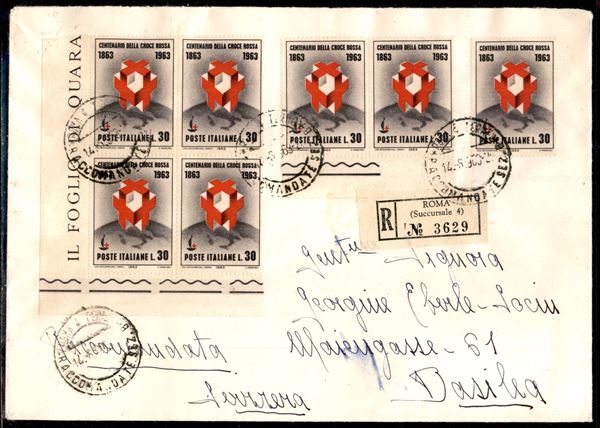 Quartina + coppia + singolo 30 lire Centenario della Croce Rossa (963) su raccomandata da Roma per Basilea del 14.6.963