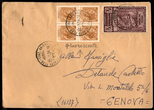 Quartina del 6 lire Siracusana (1069) + Marca da Bollo Industria e Commercio 20 lire su lettera da Genova per cittą del 20.7.74