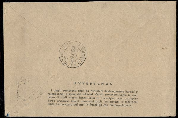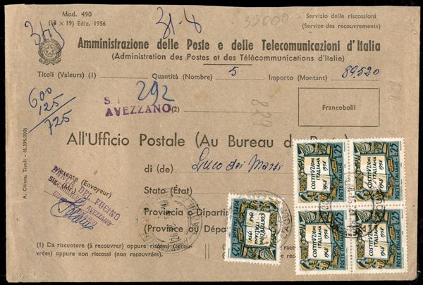 Quartina + singolo 25 lire Costituzione (829) su busta mod. 490 servizio riscossioni da Avezzano per Luco dei Marsi del 26.8.58