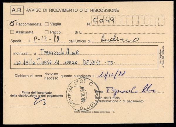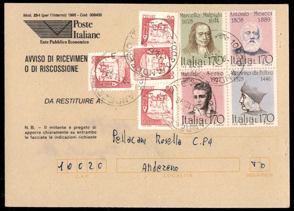 Quattro 30 lire Castelli Macchinette + blocco di quattro Personaggi Illustri (1528 + 1016/1017 + 1020/1021) su ricevuta di ritorno con annullo Andezeno 9.12.98