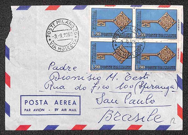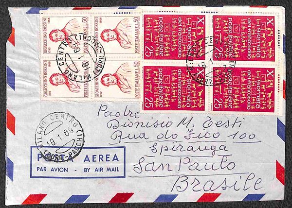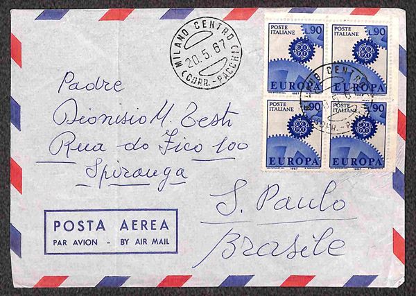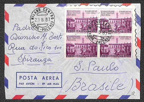 Quattro aerogrammi per il Brasile periodo 1967/1969 affrancati con commemorativi diversi in quartine - tre con valori da 90 lire