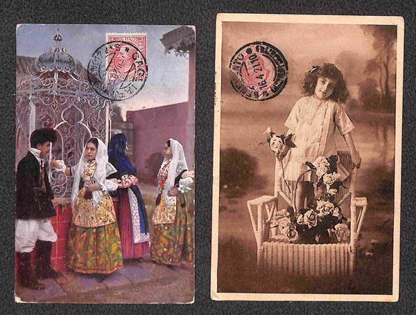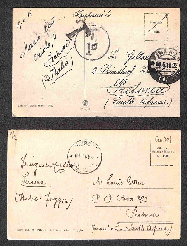 Quattro cartoline dirette a Pretoria nel Transvaal affrancate con Floreale o Leoni fra 1919 e 1921 - destinazione non comune