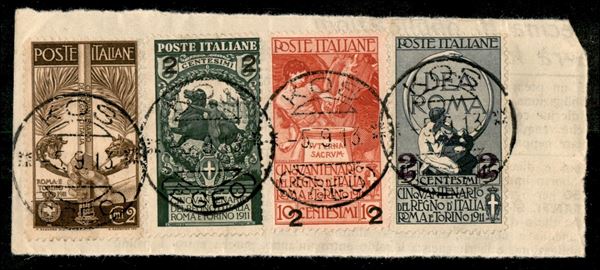 Quattro valori di Regno (92 + 99/101) usati a Kos il 5.9.13 su frammento di giornale