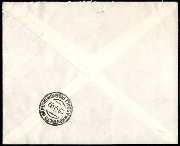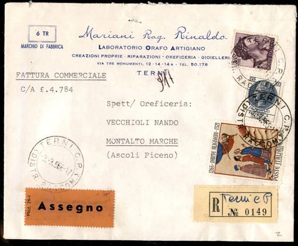 Raccomandata assegno da Terni per Montalto Marche affrancata 90 lire Dante + 200 lire Siracusana + 30 lire Michelangiolesca
