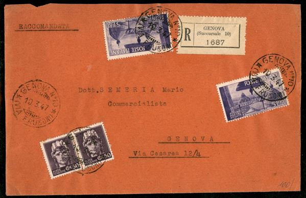 Raccomandata con Imperiale senza fasci coppia 50 cent + Avvento della Repubblica due 5 lire (538 + 570) da Genova 10.3.47 per cittą